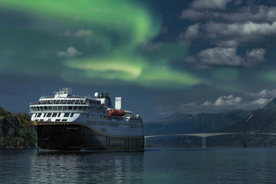 Cruise ships sailing within the Arctic Circle between late autumn and early spring offer the best platforms for aurora viewing, combining mobility with expansive sea views and on-deck visibility.