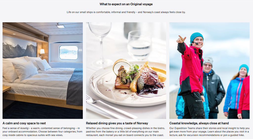 - Focus: Traditional coastal cruise along Norway’s coastline with frequent port calls.